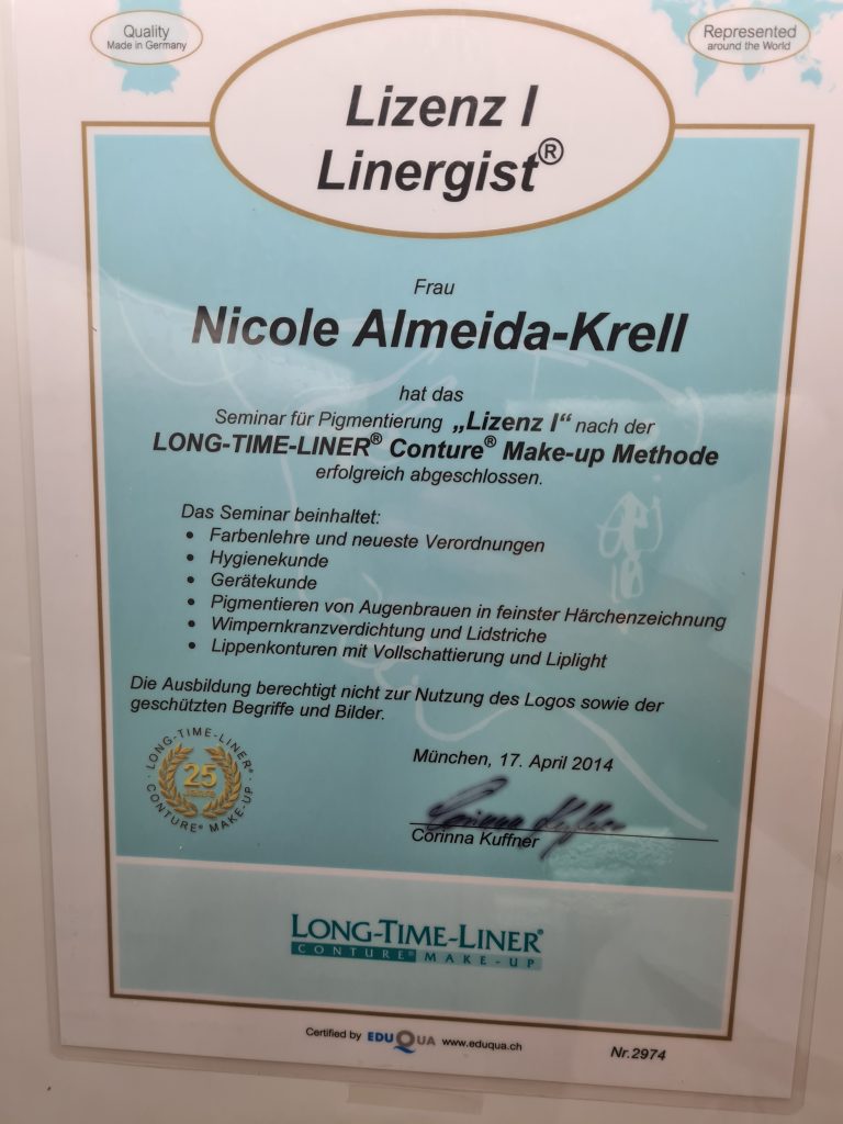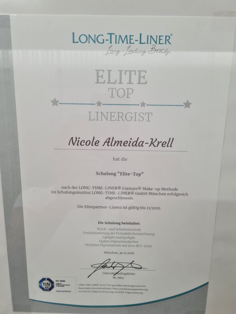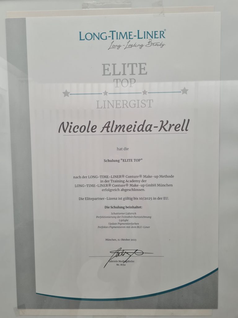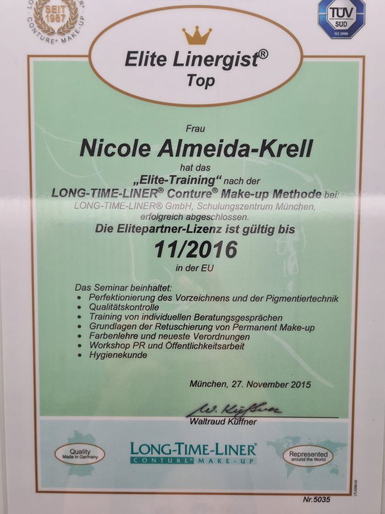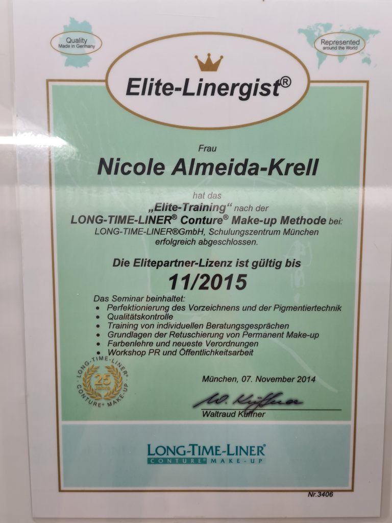Als Elite-Linergist® habe ich bei der Firma Long-Time-Liner® in München eine umfassende Ausbildung im Bereich Permanent Make-up absolviert. Eine jährliche Schulung und Qualitätskontrolle im Schulungsinstitut in München sind Voraussetzung, um lizensierter Partner zu sein und um Ihnen ein Permanent Make-up / Microblading der Premiumklasse zu bieten.